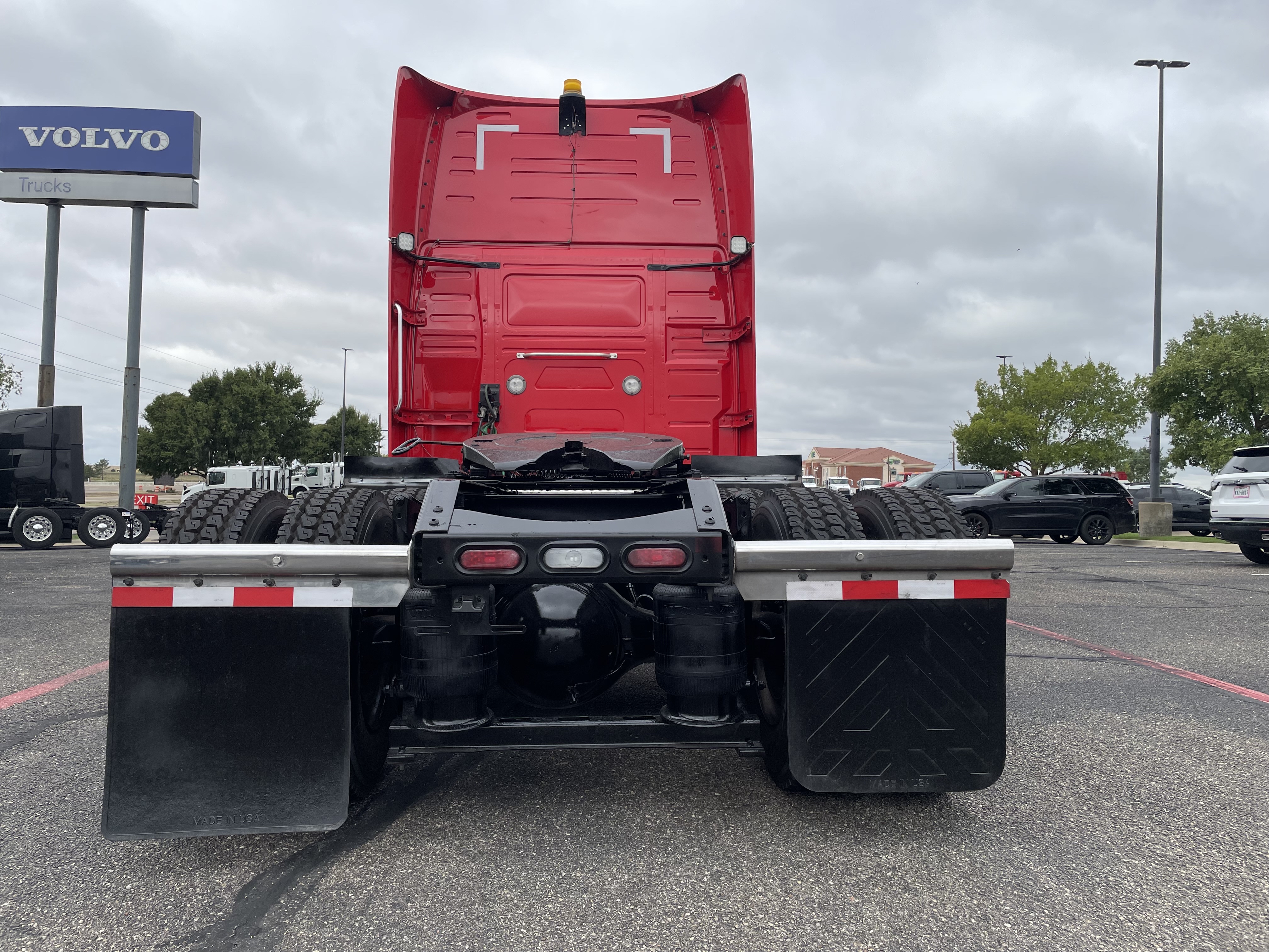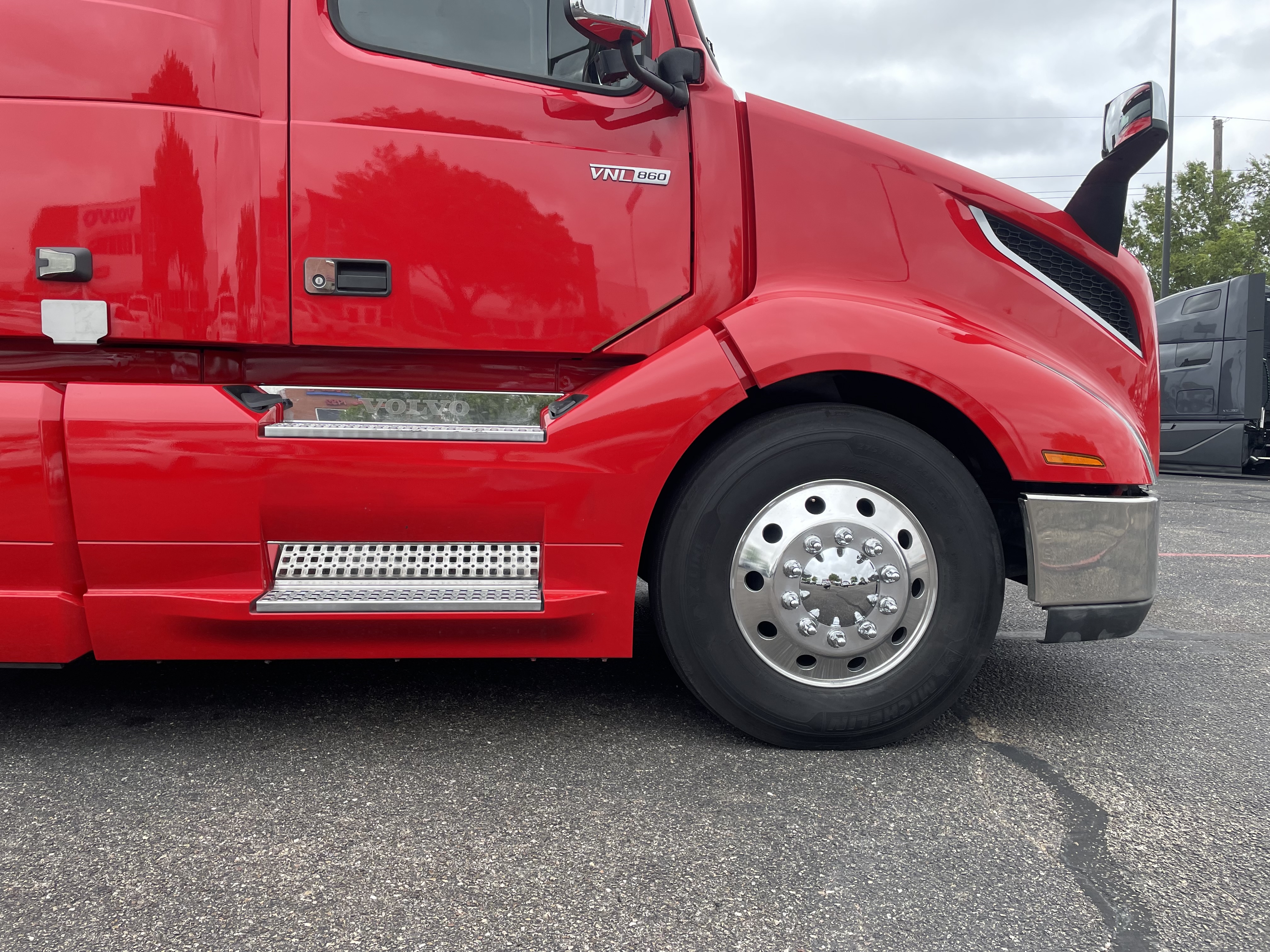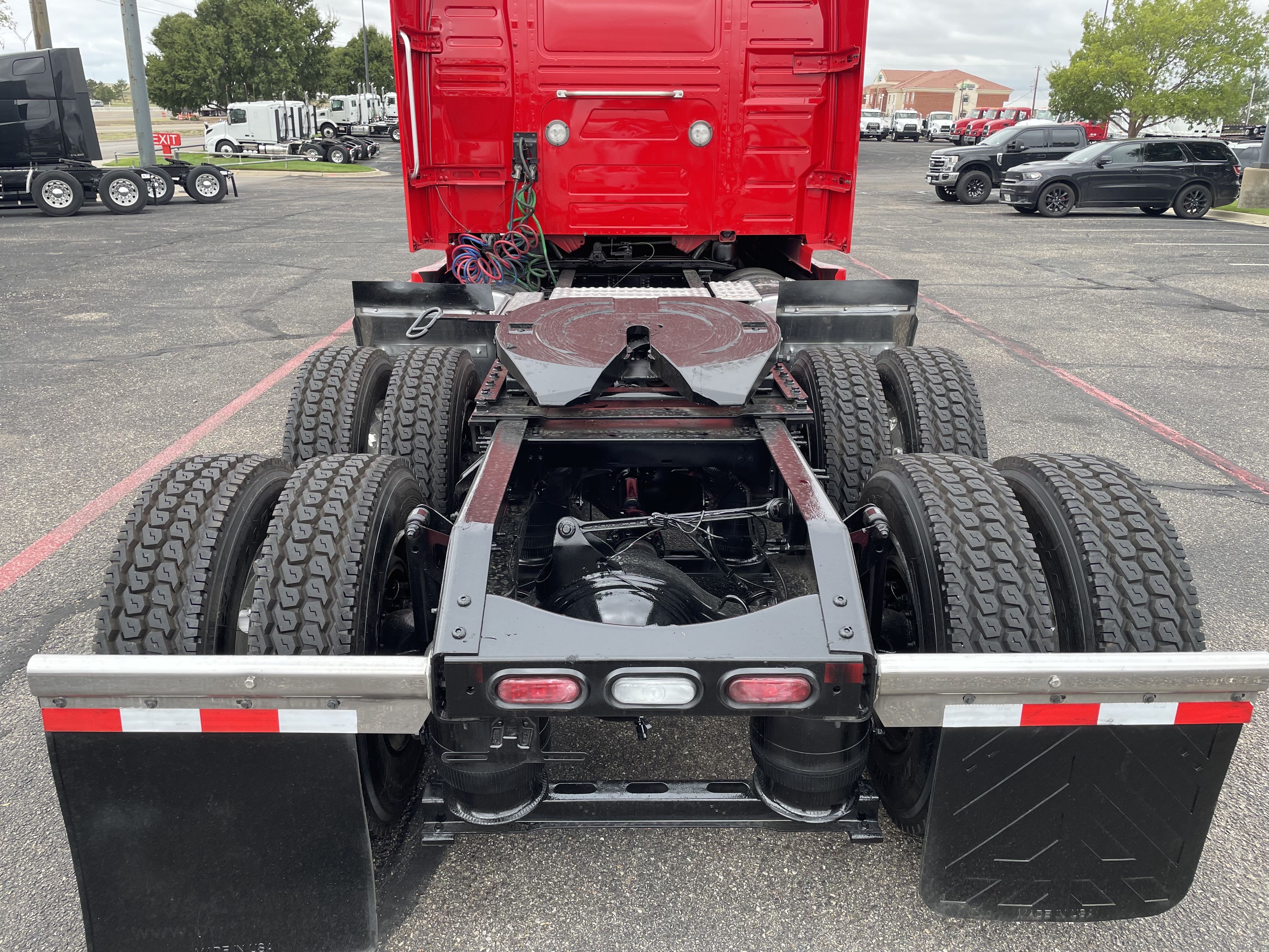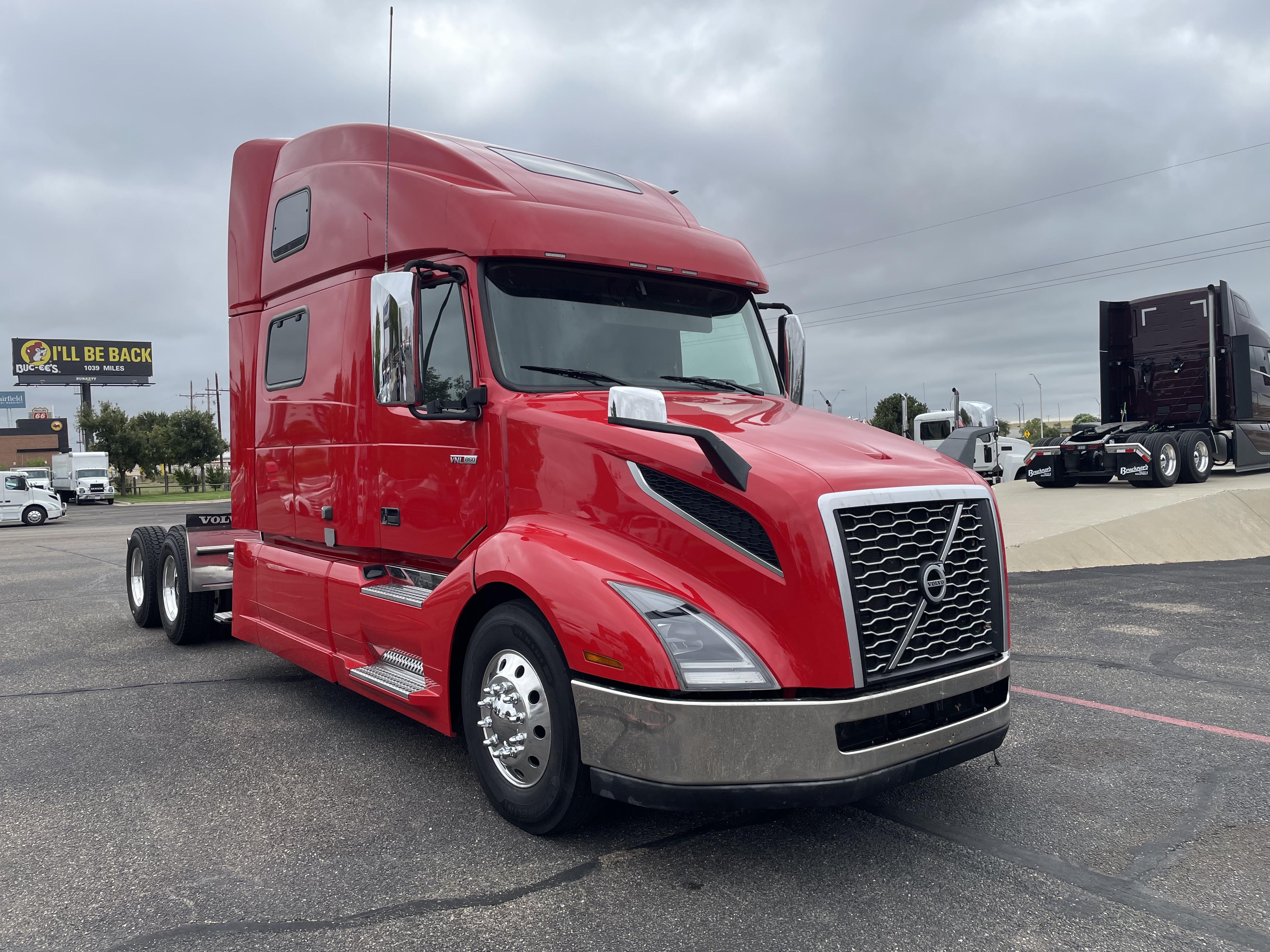 2023 used red Volvo VNL64T860 Sleeper. Volvo D13 engine with 445HP. Volvo I-Shift 12 speed automated transmission. Front axle weight 13,200 and rear axle weight 38,000. Rear ratio 2.64 and wheelbase 252. Air Ride suspension on a tandem axle. JOST fifth wheel, virgin rubber tires, and double bunk beds.