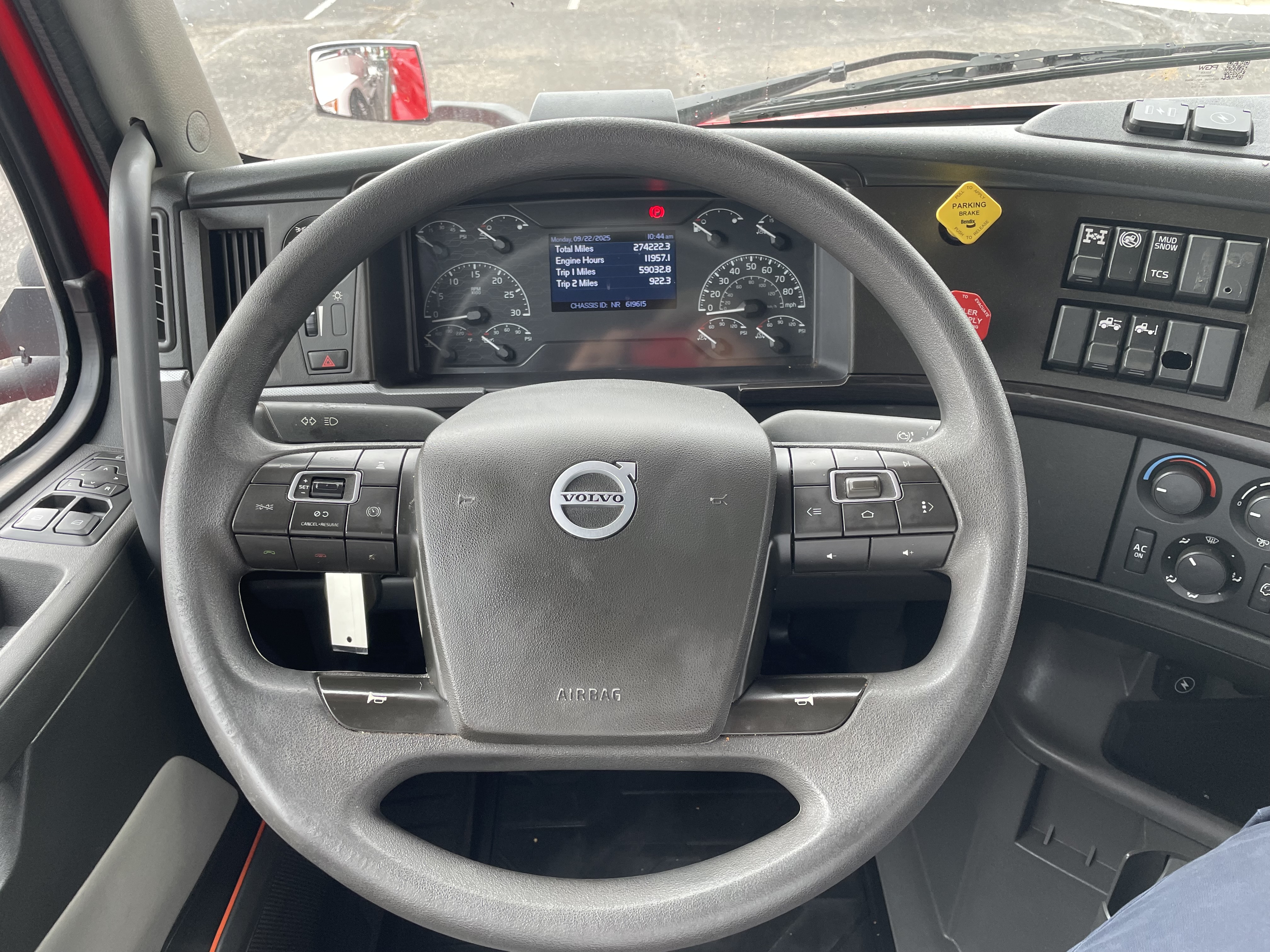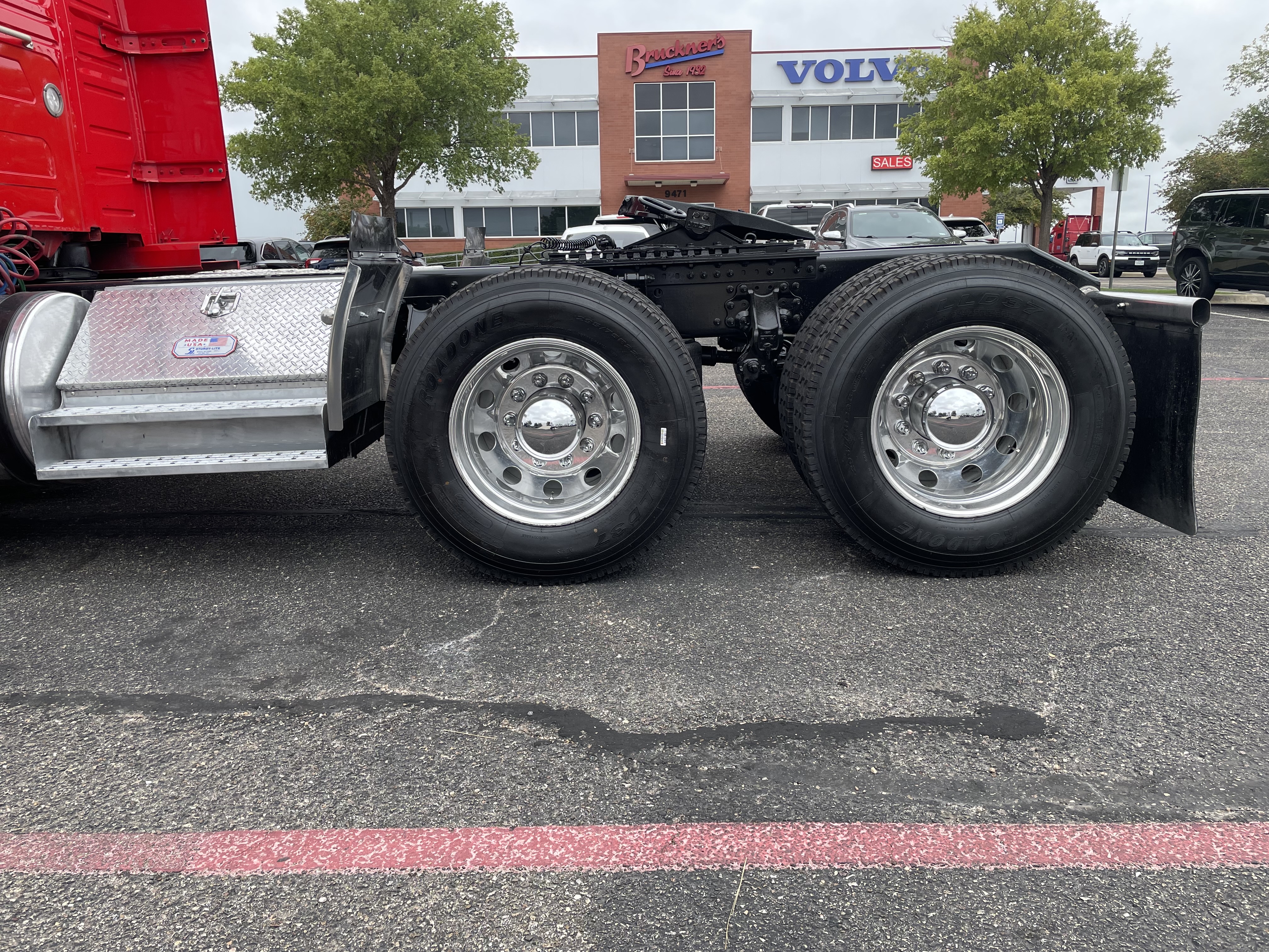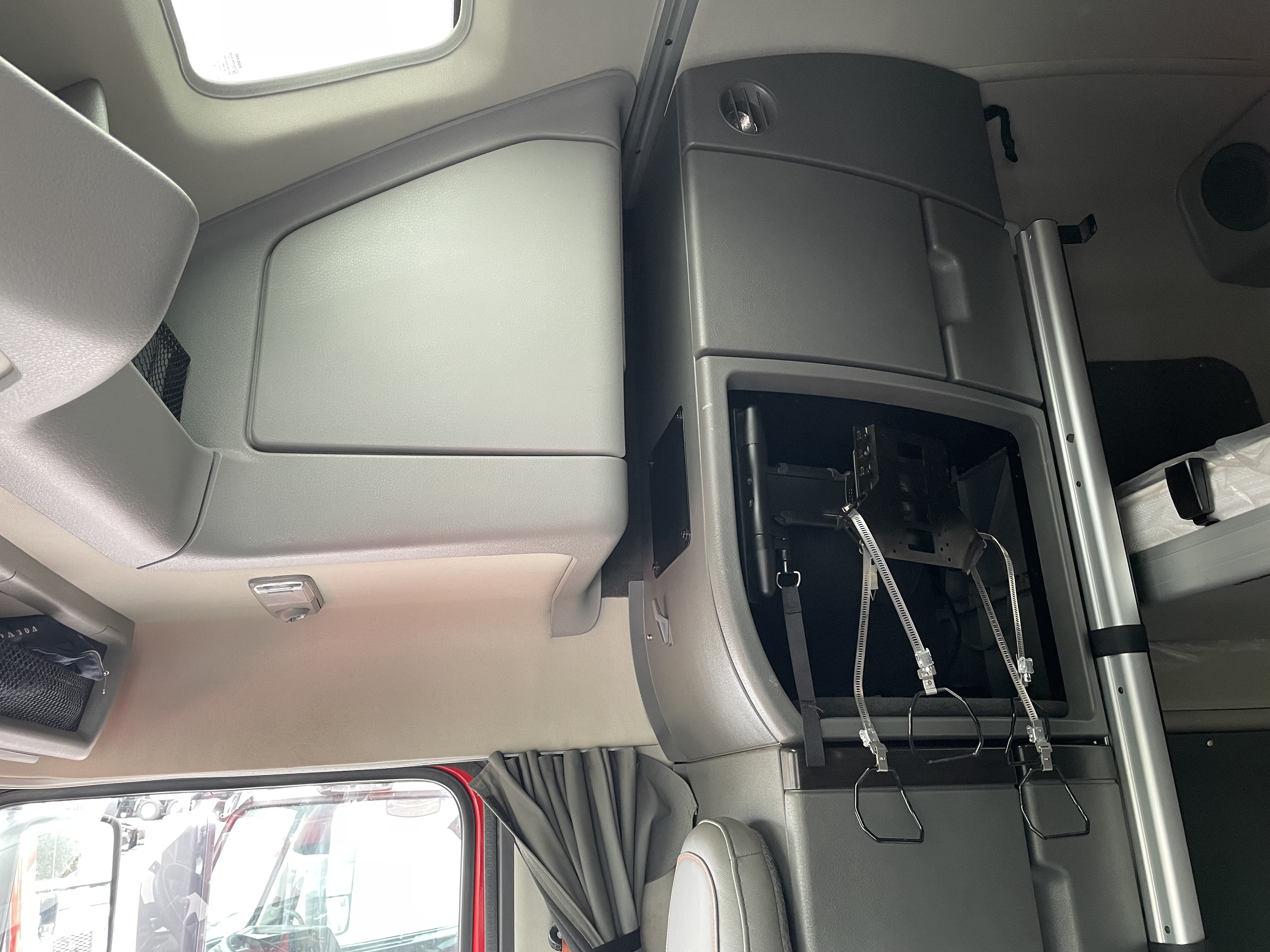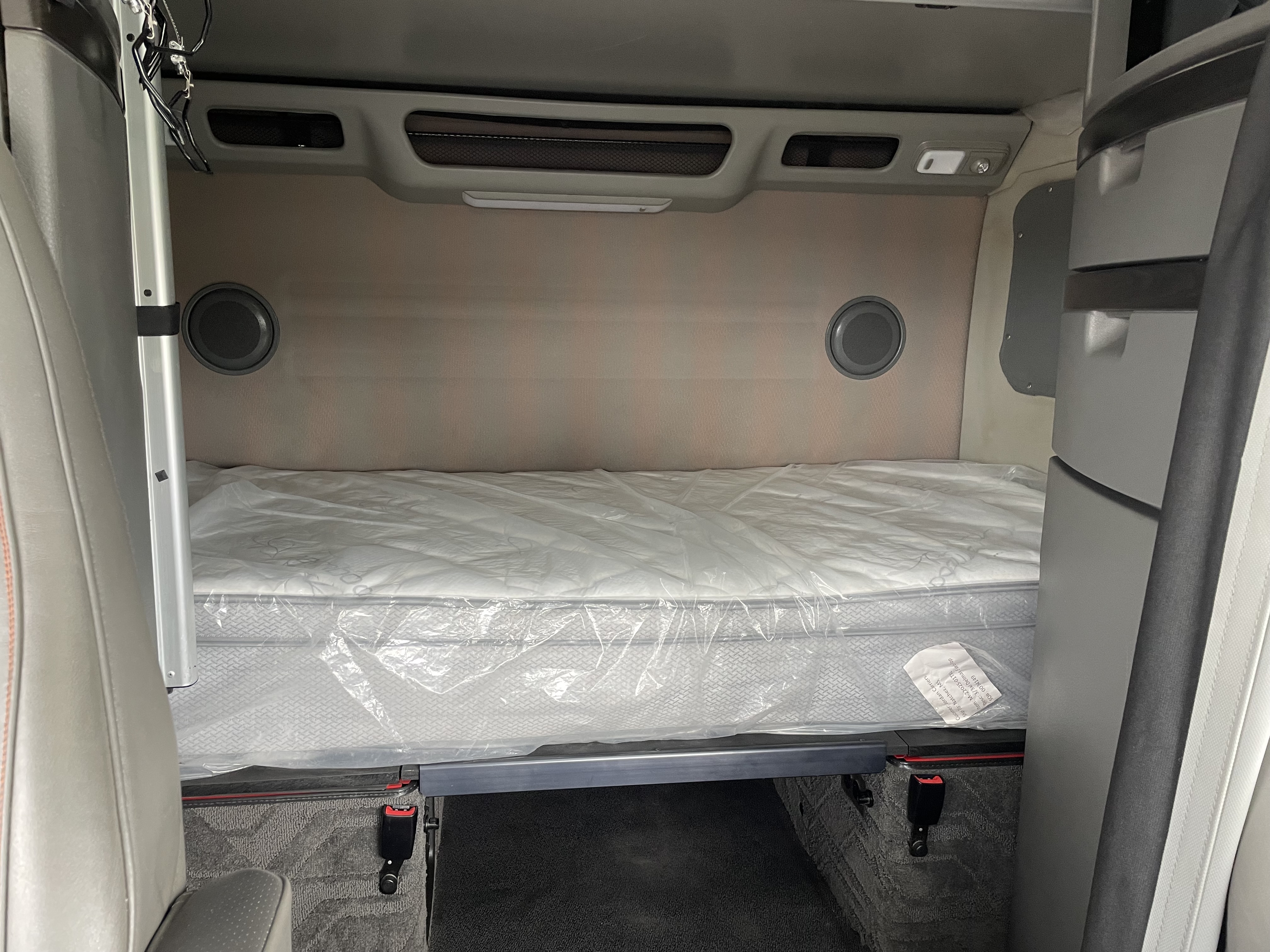 2023 used red Volvo VNL64T860 Sleeper. Volvo D13 engine with 445HP. Volvo I-Shift 12 speed automated transmission. Front axle weight 13,200 and rear axle weight 38,000. Rear ratio 2.64 and wheelbase 252. Air Ride suspension on a tandem axle. JOST fifth wheel, virgin rubber tires, and double bunk beds.