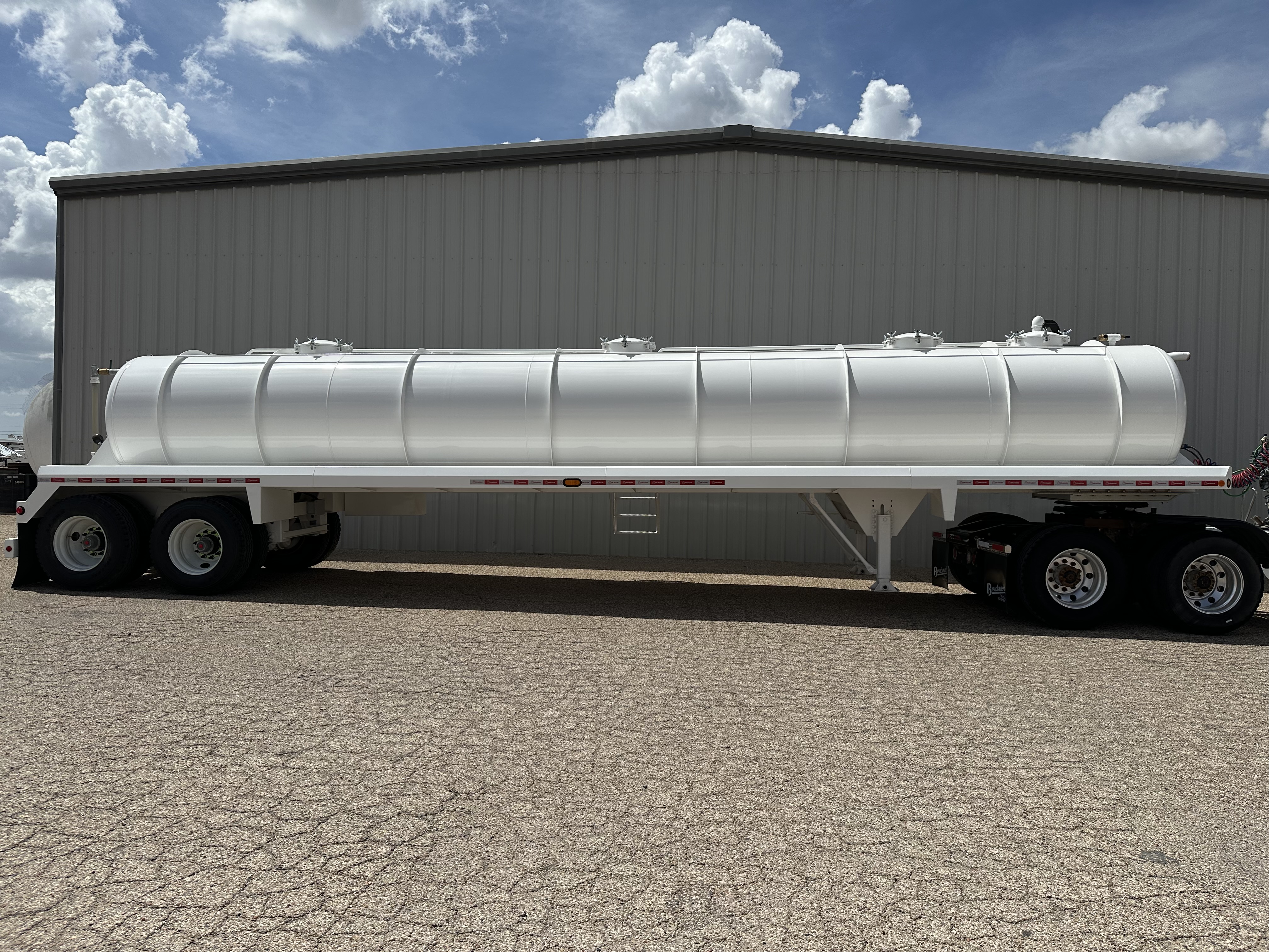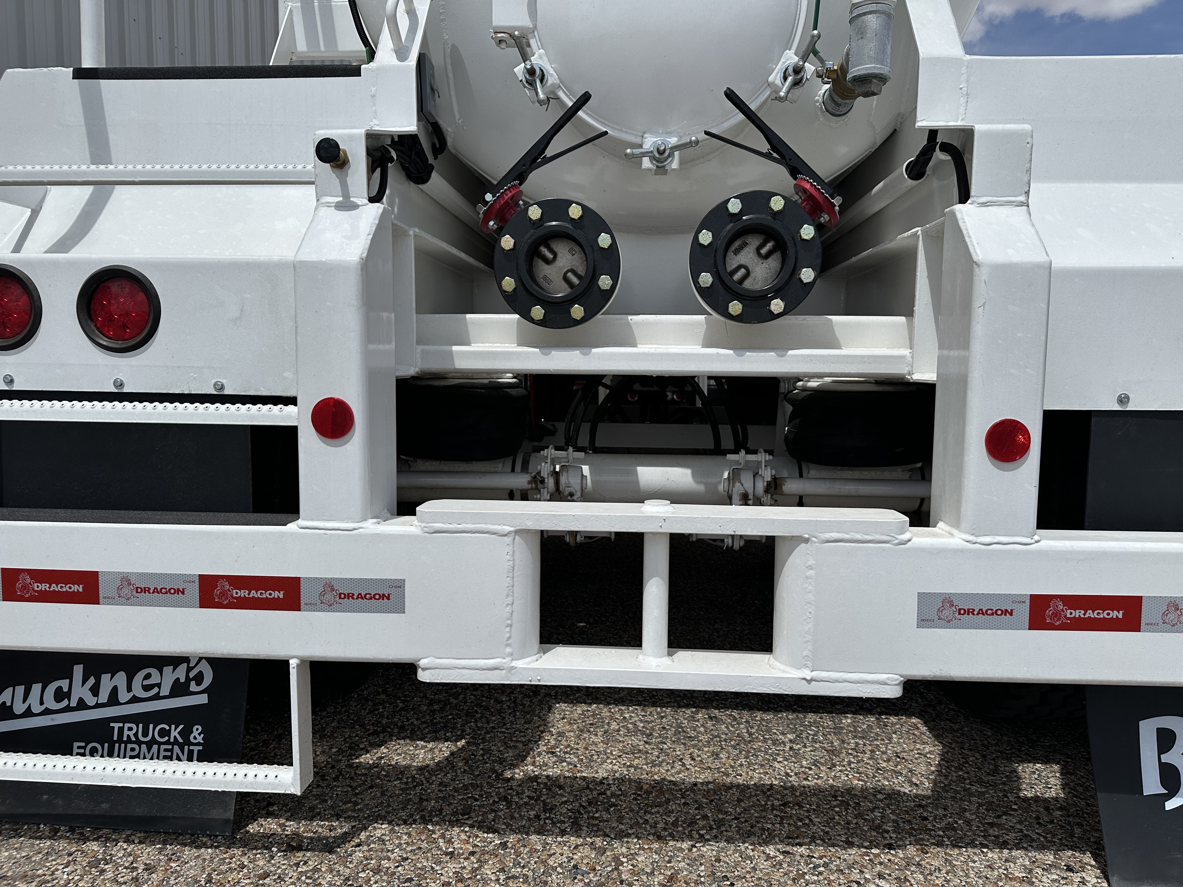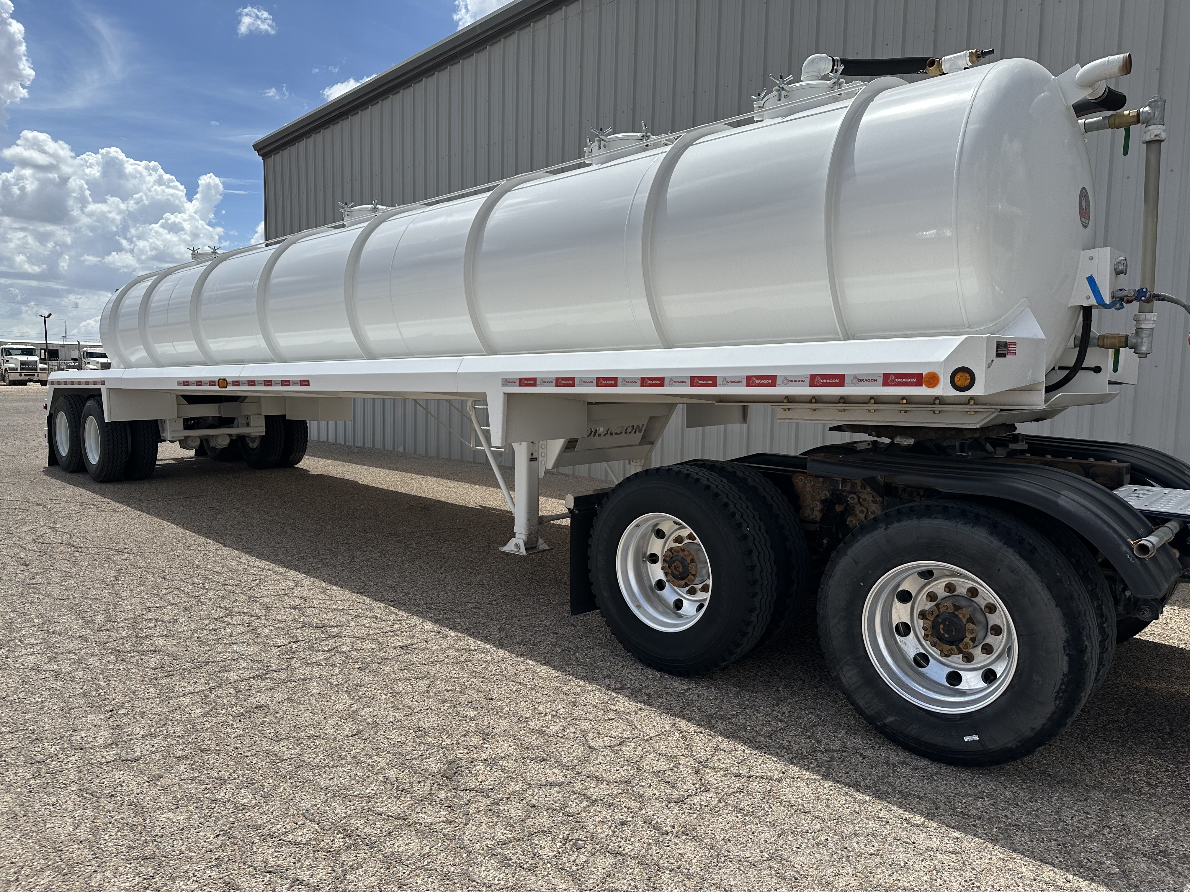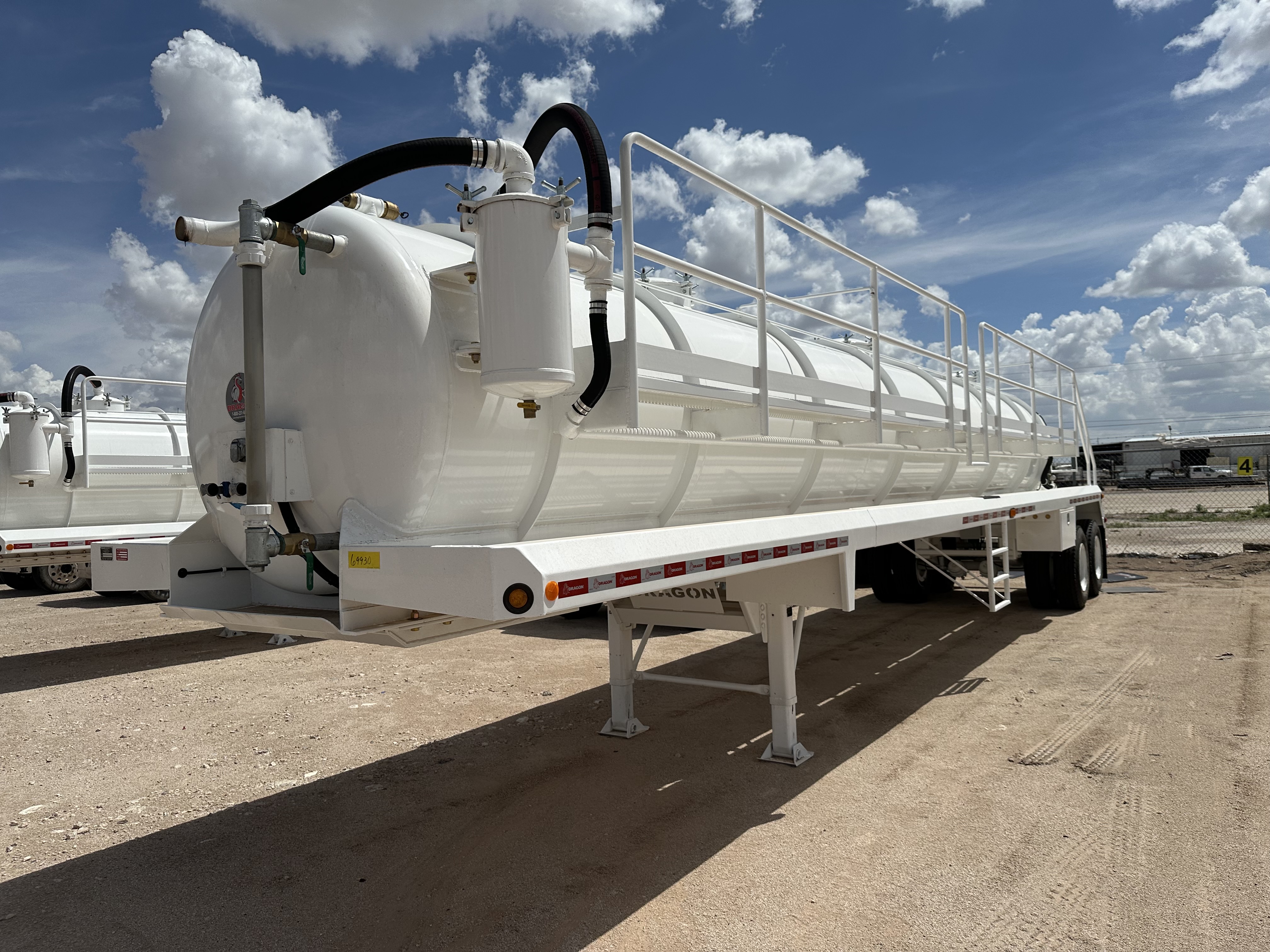 New 2026 Dragon 130 BBL vacuum trailer, approximately 5,460 gallons plus 2% it is a heavy-duty, non-code, single-compartment vacuum tanker designed for large-scale industrial fluid and oilfield hauling. Two 4” butterfly 21” domed top manways, driver-side walkway with handrails, work lights at rear, heavy-duty 2-speed landing gear, and toolbox included. Air Ride suspension 11R 22.5 steel wheels, sight glass in the front and rear.