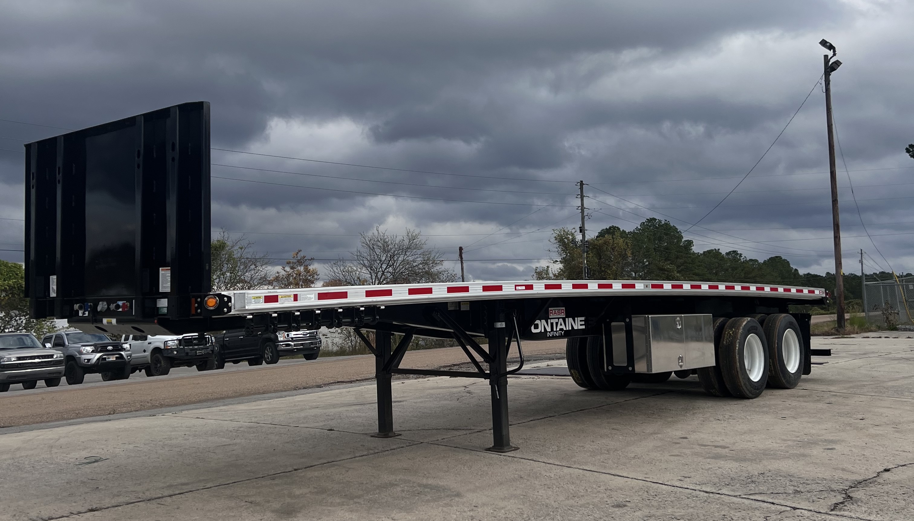 36'-6" x 102", Infinity Combo, Fork Lift Kit, Aluminum Floor w/4 Wood Nailers, Stake Pockets on 24" Centers, 30" Kingpin, Removable Steel Post Bulkhead (Part of Counterweight, Not to be Removed), 295/75R22.5 Tires, Steel Wheels, Auto Sensing Front Axle Lift (Lifts when not Loaded), 12 Sliding Winches (6 Per Side), 1 Double Door Aluminum Tool Box 24" x 24" x 60" on Roadside, Counterweights for Maximum 8,400 lb. Forklift, Price Includes F.E.T. Sitting at the Factory