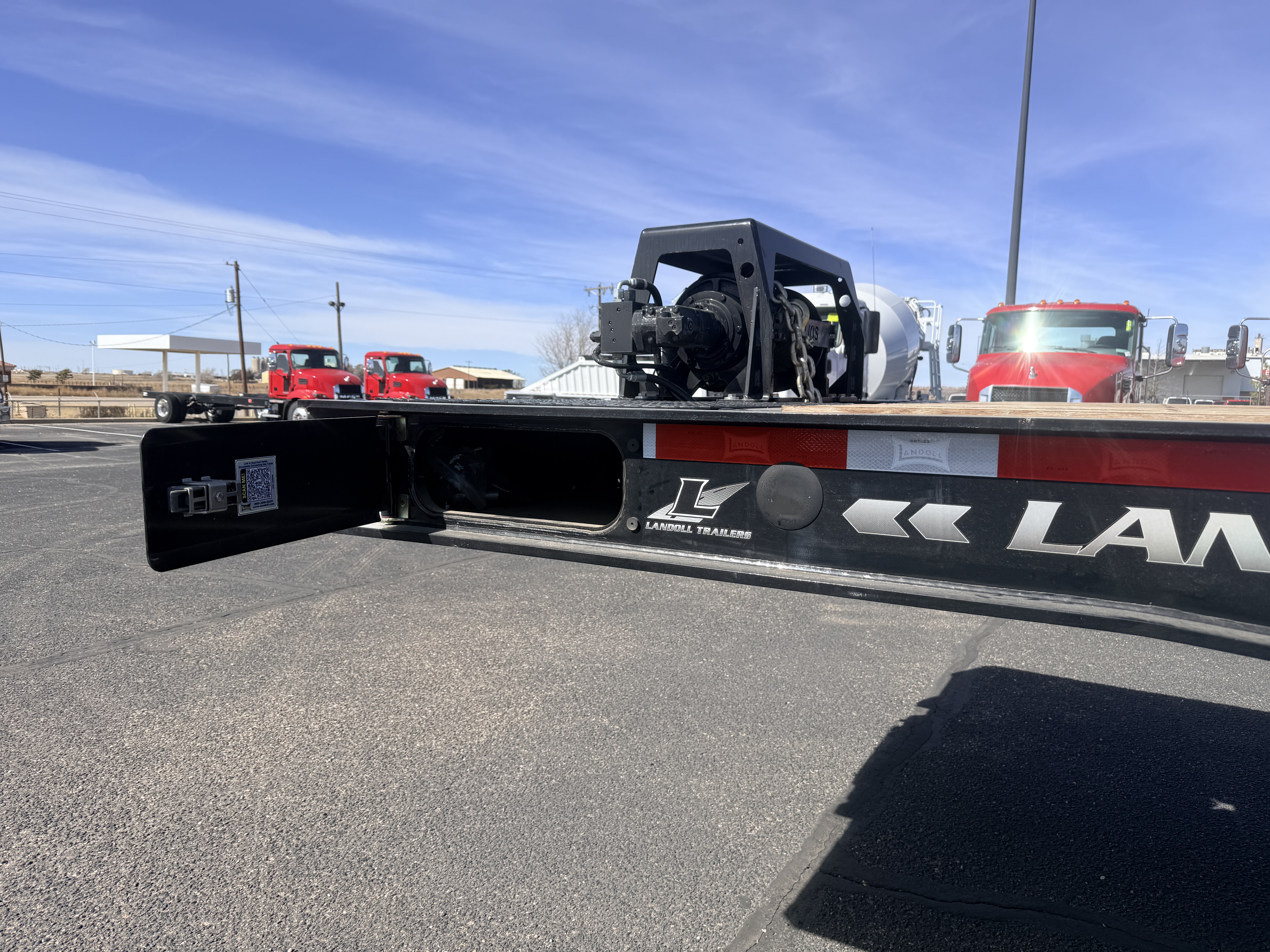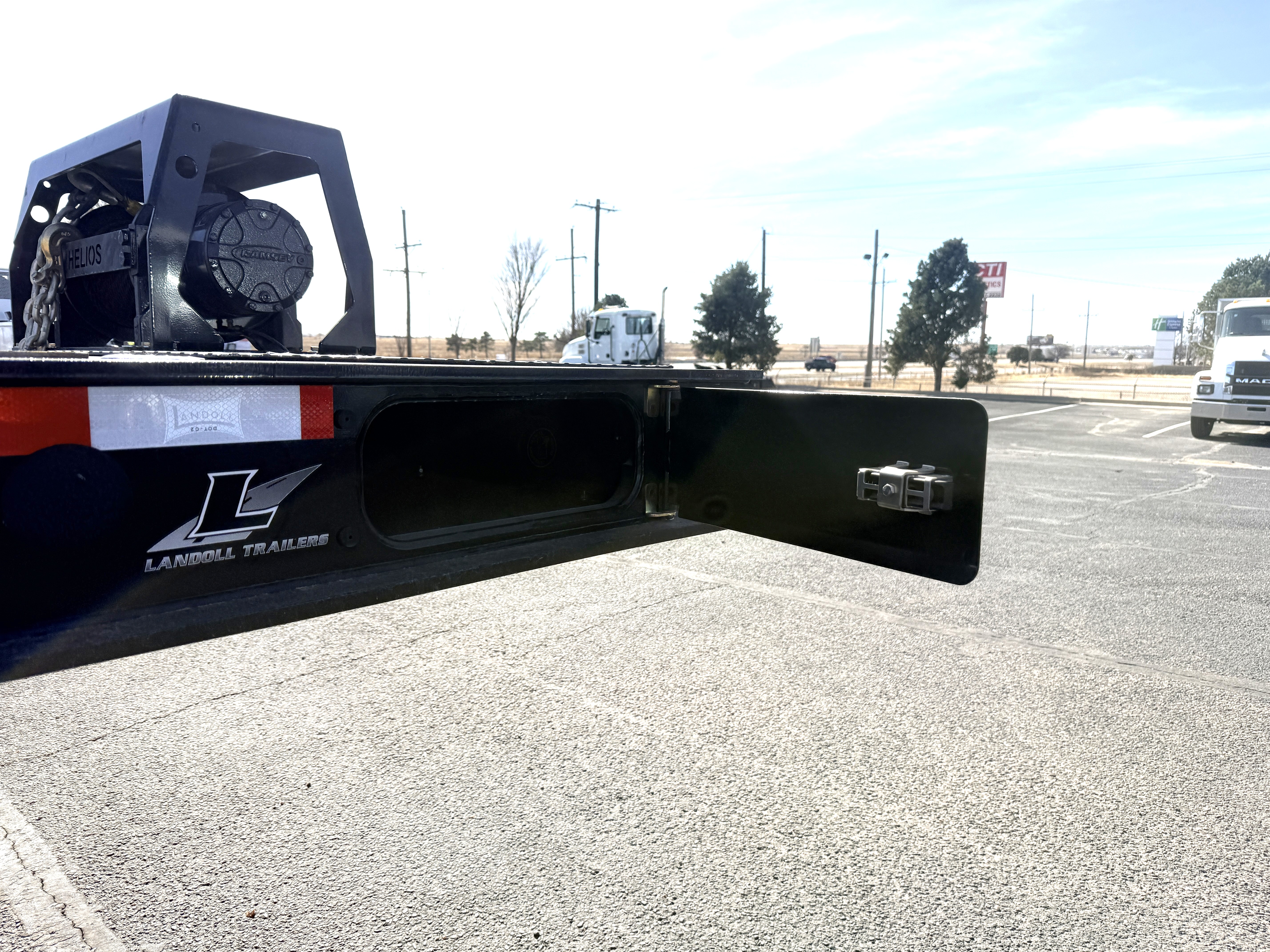 53' x 102" Traveling Axle, 40 Ton Capacity, Deck Rating 50,000 lbs. in 10 ft., 6.5 Degree Load Angle, 20,000 lb. Ramsey Winch, (2) Side Opening Tool Boxes on Upper Deck, Jost 2-Speed Landing Legs, 37" Loaded Deck Height, Keyhole Tie Downs on Upper & Lower Deck, Dual LED Work Lights, Folding Steps on Curbside & Road Side, 6-Way Wireless Remote, Container Skid Plates, Under Deck Work Zone Lights, Strobes Lights in Rear Bumper, PSI Tire Inflation System, Polished Outside Aluminum Wheels, Price Includes F.E.T.